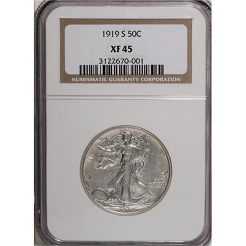 <B>1919-S 50C XF45 NGC.</B></I> A lightly circulated, subtly radiant silver-gray example that offers surprisingly strong surface quality. Light, even wear over the well struck devices accounts for the grade.<BR><BR><B>Coin Engraver:</B> Adolph A. Weinman<BR><BR><b>Shipping:</b> Coins & Currency (<a target="_blank" href="http://www.heritageauctions.com/common/shipping.php">view shipping information</a>)