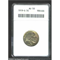 1919-S 5C AU50 ANACS. A lightly toned and strongly struck example of this scarce, semi-key issue.From the Ohio Collection. Important notice: We expect to be auctioning lots at the rate of 200-250 per hour. Sometimes eBay Premier live bid software cannot keep up with that pace, so we strongly recommend that you place a realistic proxy bid now as insurance to avoid disappointment. Also please note that all Heritage/CAA lots purchased through eBay Premier carry a 20% Buyer's Premium. Please make sure you read the Terms and Conditions.