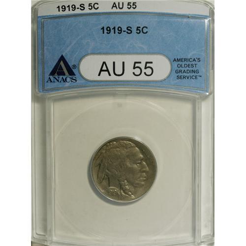 <B>1919-S 5C AU55 ANACS.</B></I> NGC Census: (30/332). PCGS Population (35/489). Mintage: 7,521,000. Numismedia Wsl. Price: $292. (#3943)<BR><BR><b>Shipping:</b> Coins & Currency (<a target="_blank" href="http://www.heritageauctions.com/common/shipping.php">view shipping information</a>)