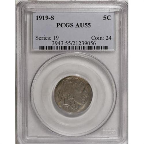 <B>1919-S 5C AU55 PCGS.</B></I> . PCGS Population (38/518). NGC Census: (31/344). Mintage: 7,521,000. Numismedia Wsl. Price for NGC/PCGS coin in AU55: $292. (#3943)<BR><BR><B>Coin Engraver:</B> James E. Fraser<BR><BR><b>Shipping:</b> Coins & Currency (<a target="_blank" href="http://www.heritageauctions.com/common/shipping.php">view shipping information</a>)