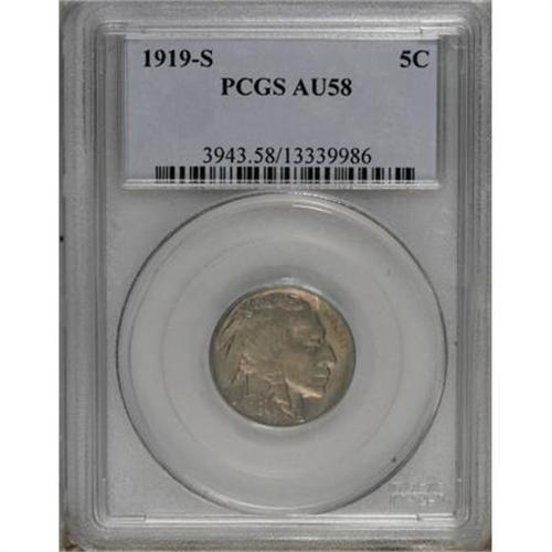 <B>1919-S 5C AU58 PCGS.</B></I> . PCGS Population (69/451). NGC Census: (59/286). Mintage: 7,521,000. Numismedia Wsl. Price for NGC/PCGS coin in AU58: $350. (#3943)<BR><BR><B>Coin Engraver:</B> James E. Fraser<BR><BR><b>Shipping:</b> Coins & Currency (<a target="_blank" href="http://www.heritageauctions.com/common/shipping.php">view shipping information</a>)