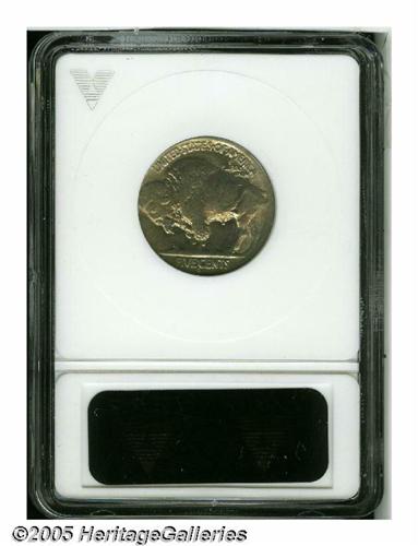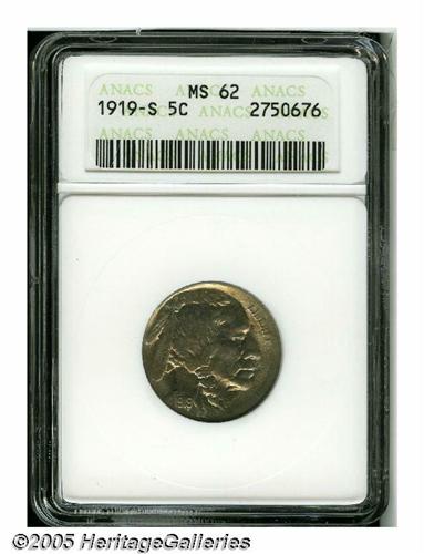 <B>1919-S<5C> MS62 ANACS.</B></I> Lustrous nickel-gray surfaces display hints of light tan color, and appear to be free of significant marks. Portions of the peripheral strike are soft, as exemplified by the tops of the letters in LIBERTY, the hair on the bison's head, and the curve in the tail. The date (except for the first digit), the reverse lettering, and the mintmark are strong.