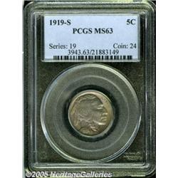 <B>1919-S 5C MS63 PCGS.</B></I> A mix of rose and gold patina bathes lustrous surfaces. Weakly struck on portions of the reverse.