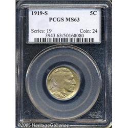 <B>1919-S 5C MS63 PCGS.</B></I> Softly defined, as befits the issue, with muted surfaces beneath champagne-gray toning. Elusive at the present level, the '19-S is quite costly finer. Lot:5982