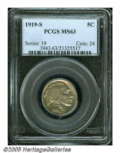 <B>1919-S<5C> MS63 PCGS.</B></I> Variegated golden-brown and lavender colors embrace this shimmering and carefully preserved better date Nickel. Although the strike is not full in the centers, all legends are crisp, and the devices are sharper than generally encountered.