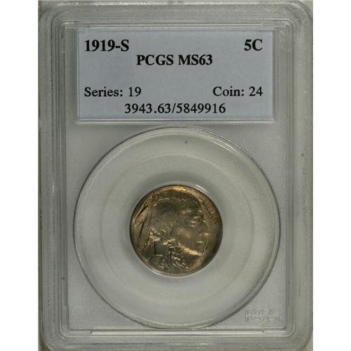 <B>1919-S 5C MS63 PCGS.</B></I> Warm apricot-gray toning enhances the eye appeal of this Select piece. There are no mentionable abrasions or carbon spots, and the bison's horn is full, but the peripheral detail shows the softness typical for this issue.<BR><BR><b>Shipping:</b> Coin/Currency (<a target="_blank" href="http://www.heritageauctions.com/common/shipping.php">view shipping information</a>)