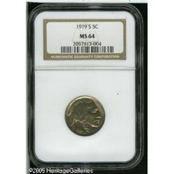 <B>1919-S 5C MS64 NGC.</B></I> The strike on this lustrous near-Gem example far surpasses what is normally seen on the 1919-S, a challenging strike rarity. Lustrous surfaces are draped in natural champagne-golden patina and only the mintmark displays any obvious deficiency in strike. Rarely seen finer. Lot:5983