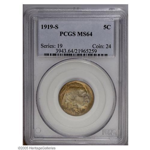 <B>1919-S<5C> MS64 PCGS.</B></I> Intense gold and iridescent color is noted on both sides of this Choice Mint State example. Typical of nearly every example, this one has some peripheral weakness on both sides with LIBERTY merged into the border. Only 27 finer examples of this date have been certified by PCGS (10/05).