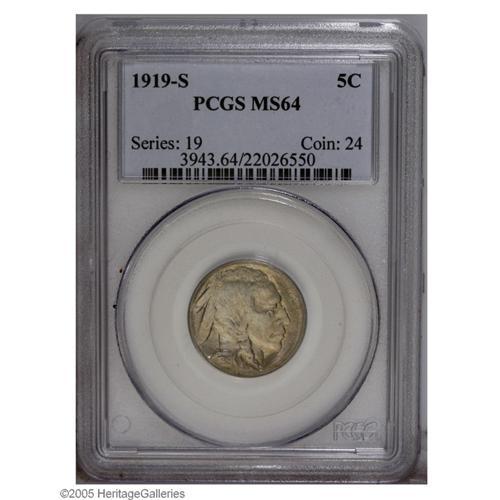 1919-S 5C MS64 PCGS. Lovely ice-blue, orange, and oliv 1919-S[5C] MS64 PCGS.