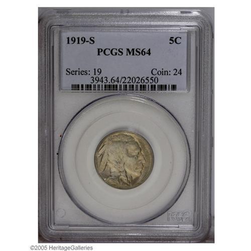<B>1919-S<5C> MS64 PCGS.</B></I> Lovely ice-blue, orange, and olive tints grace this lustrous near-Gem. Outstanding from a technical perspective, since no contact is detected. A small lamination (as produced) is noted on the bison's front leg. Struck from late in life dies, the fields display an orange peel texture, and die wear reduces peripheral details, as made.