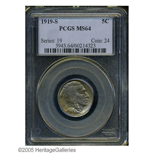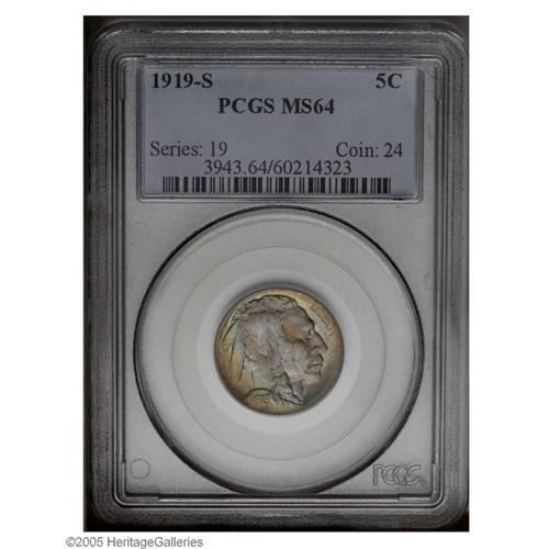 <B>1919-S<5C> MS64 PCGS.</B></I> The 1919-S is one of the most highly respected issues in the Buffalo Nickel series. It is scarce in all grades above VF and true Gems are extremely rare. This near-Gem is typically struck overall with some weakness on LIBERTY on the obverse, while the reverse displays the usual softness on the bison's head and tail. Beautifully toned in concentric shades of crimson, ice-blue, and gold with strong underlying mint frost.