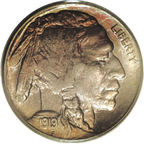 <B>1919-S<5C> MS64 PCGS.</B></I> The hits just keep on coming in this phenomenal run of rare Buffalo nickels, most of them certified in early green label PCGS holders. The 1919-S is notorious for weak strikes, especially on the reverse. The present piece is typically struck, showing weakness on the head, shoulders, and tail. A couple of light carbon spots are seen near the eye. On the plus side, the luster is brilliant, and both sides offer a generous helping of pastel rose and lilac toning. The mintmark and denomination are sharp. An appealing piece. PCGS has graded 27 coins finer (4/06).