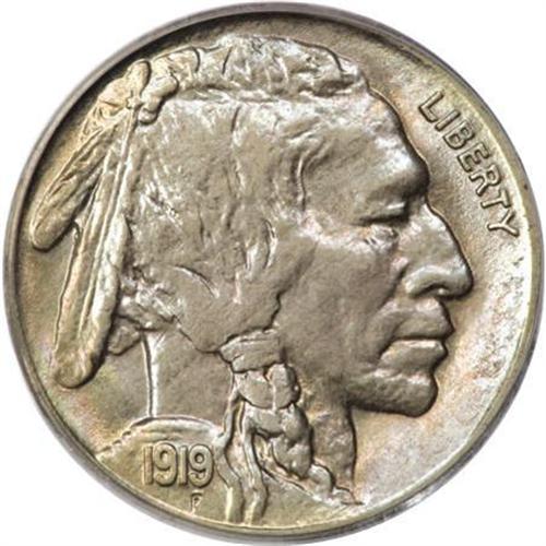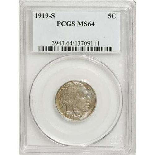 <B>1919-S 5C MS64 PCGS.</B></I> This near-Gem displays a better-than-average-strike for a date that David Lange (2006) says "... is notorious for being weakly struck, particularly on the reverse. Problem areas include the border, denomination, mintmark and the bison's head with its all-important horn." Except for softness on portions of the bison's hair, the aforementioned elements are nicely defined, including the horn. Soft rainbow toning rests on lustrous surfaces that are devoid of mentionable marks or spots.<BR><BR><B>Coin Engraver:</B> James E. Fraser<BR><BR><b>Shipping:</b> Coins & Currency (<a target="_blank" href="http://www.heritageauctions.com/common/shipping.php">view shipping information</a>)