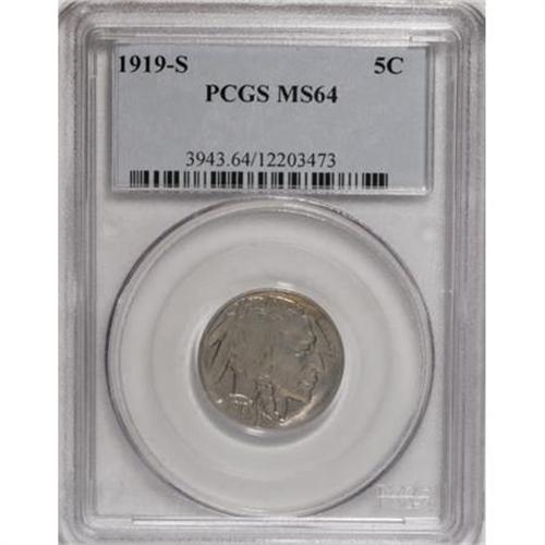 <B>1919-S 5C MS64 PCGS.</B></I> An outstanding piece with satiny light gray luster and faint gold toning along the peripheries, especially on the reverse. The 1919-S nickel is a condition rarity that is seldom seen in higher grades. PCGS has only certified 33 examples of the date in better grades than this piece.<BR><I>From The John Stimson, Sr. Collection, Part Two.</B></I><BR><BR><B>Coin Engraver:</B> James E. Fraser<BR><BR><b>Shipping:</b> Coins & Currency (<a target="_blank" href="http://www.heritageauctions.com/common/shipping.php">view shipping information</a>)