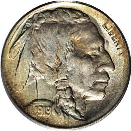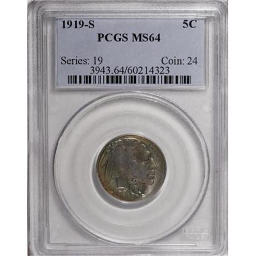 <B>1919-S 5C MS64 PCGS.</B></I> The 1919-S is one of the most highly respected issues in the Buffalo nickel series. It is scarce in all grades above VF, and true Gems are rare. Beautifully toned in concentric shades of crimson, ice-blue, and gold with strong underlying mint frost. The borders are typically brought up, although the mintmark is crisp, as is the Indian's profile.<BR><BR><B>Coin Engraver:</B> James E. Fraser<BR><BR><b>Shipping:</b> Coins & Currency (<a target="_blank" href="http://www.heritageauctions.com/common/shipping.php">view shipping information</a>)