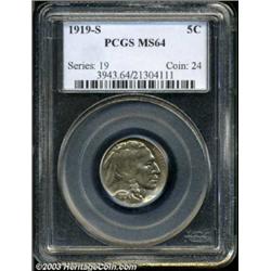 <TABLE cellSpacing=0 cellPadding=0 width="100%" bgColor=#000000 border=0><TBODY><TR><TD width="100%"><TABLE cellSpacing=1 cellPadding=3 width="100%" border=0><TBODY><TR><TD width="100%" bgColor=#79735c><FONT face=arial color=#ffffff size=3><B>Description</B> </FONT></TD></TR><TR><TD width="100%" bgColor=#ffffff><FONT face=arial size=2><B>1919-S 5C MS64 PCGS.</B></I> The 1919-S is notorious for being weakly struck, and the definition in a few areas may be what keeps the current example from an MS65 grade. It is certainly not abrasions, as there are few, and none are individually distracting. Neither is it the luster quality, as both sides display a shimmering, satin textured sheen. While there is some bluntness of detail over a few of the central and peripheral features, the overall detail is bold and well above average for the issue. Nicely blended golden-olive and amber patina overlays all features, and enhances the already noteworthy eye appeal. A die lump (as produced), resides directly beneath the Indian's eye. There are not many '19-S Nickels certified finer than MS64 at NGC and PCGS. </FONT></TD></TR></TBODY></TABLE></TD></TR></TBODY></TABLE><BR><A name=PricesRealized></A><TABLE cellSpacing=0 cellPadding=0 width="100%" bgColor=#000000 border=0><TBODY><TR><TD width="100%"><TABLE cellSpacing=1 cellPadding=3 width="100%" border=0><TBODY><TR><TD width="100%" bgColor=#79735c><A name=PR><FONT face=arial color=#ffffff size=3><B>Previous Prices from Heritage Auctions</B> </FONT></A></TD></TR><TR><TD bgColor=#f6f6ed><TABLE cellSpacing=0 cellPadding=0 width="100%" border=1><TBODY><TR><TD align=middle width="33%"><B>Date</B></TD><TD align=middle width="33%"><B>Service</B></TD><TD align=middle width="33%"><B>Price</B></TD></TR><TR bgColor=whitesmoke><TD width="33%"><B>07/29/2003</B></TD><TD width="33%">PCGS</TD><TD width="33%">$2,760.00</TD></TR><TR bgColor=whitesmoke><TD width="33%"><B>06/08/2002</B></TD><TD width="33%">PCGS</TD><TD width="33%">$2,817.50</TD></TR><TR bgColor=whitesmoke><TD width="33%"><B>08/19/1995</B></TD><TD width="33%">PCGS</TD><TD width="33%">$2,970.00</TD></TR><TR bgColor=whitesmoke><TD width="33%"><B>08/02/1997</B></TD><TD width="33%">PCGS</TD><TD width="33%">$2,990.00</TD></TR><TR bgColor=whitesmoke><TD width="33%"><B>08/02/1997</B></TD><TD width="33%">PCGS</TD><TD width="33%">$2,817.50</TD></TR><TR bgColor=whitesmoke><TD width="33%"><B>09/28/2002</B></TD><TD width="33%">NGC</TD><TD width="33%">$1,955.00</TD></TR><TR bgColor=whitesmoke><TD width="33%"><B>08/01/1998</B></TD><TD width="33%">NGC</TD><TD width="33%">$2,817.00</TD></TR><TR bgColor=whitesmoke><TD width="33%"><B>03/01/2003</B></TD><TD width="33%">PCGS</TD><TD width="33%">$4,600.00</TD></TR><TR bgColor=whitesmoke><TD width="33%"><B>03/23/2003</B></TD><TD width="33%">NGC</TD><TD width="33%">$2,645.00</TD></TR></TBODY></TABLE></TD></TR><TR><TD bgColor=#ffffff><FONT face=arial size=1 ?>PLEASE NOTE: All prices realized reflect the final hammer price PLUS the buyer's premium in auctions that charge a buyer's premium. Each item has a notation at the top of the listing indicating whether that lot included a buyer's premium. Example: A item that sells with a final hammer price of $100 and a 20% buyer's premium will display with a price realized of $120. All information listed is intended to be as accurate as possible, but errors are possible. Please use this guide carefully and inform us of any inaccuracies. </FONT></TD></TR></TBODY></TABLE></TD></TR></TBODY></TABLE><BR><TABLE cellSpacing=0 cellPadding=0 width="100%" bgColor=#000000 border=0><TBODY><TR><TD width="100%"><TABLE cellSpacing=1 cellPadding=3 width="100%" border=0><TBODY><TR><TD width="100%" bgColor=#79735c colSpan=6><FONT face=arial color=#ffffff size=3><B>Price Guide*</B> </FONT></TD></TR><TR bgColor=#f6f6ed><TD align=middle><B>Grade</B> </TD><TD align=middle><B>Coin World<BR>(Trends)</B> </TD><TD align=middle><B>Numismedia<BR>Retail</B> </TD><TD align=middle><B>Numismedia<BR>Wholesale</B> </TD><TD align=middle><B>Coin<BR>Universe</B> </TD><TD align=middle><B>Heritage<BR>Value Index</B> </TD></TR><TR bgColor=#ffffff><TD align=middle>63</TD><TD align=right>$1,500.00</TD><TD align=right>---</TD><TD align=right>$1,025.00</TD><TD align=right>$1,350.00</TD><TD align=right>$959.00</TD></TR><TR style="FONT-WEIGHT: bold" bgColor=#cccfdd><TD align=middle>64</TD><TD align=right>$4,000.00</TD><TD align=right>---</TD><TD align=right>$2,975.00</TD><TD align=right>$3,750.00</TD><TD align=right>$2,673.75</TD></TR><TR bgColor=#ffffff><TD align=middle>65</TD><TD align=right>$17,500.00</TD><TD align=right>---</TD><TD align=right>$11,500.00</TD><TD align=right>$17,500.00</TD><TD align=right>$10,737.50</TD></TR><TR bgColor=#ffffff><TD colSpan=6><FONT size=1>*All information listed is intended to be as accurate as possible, but errors are possible. No item may be returned or refused based on this information which is provided as a service to our customers. You should contact each pricing source directly to determine the accuracy of this information. </FONT></TD></TR></TBODY></TABLE></TD></TR></TBODY></TABLE><BR><TABLE cellSpacing=0 cellPadding=0 width="100%" bgColor=#000000 border=0><TBODY><TR><TD width="100%"><TABLE cellSpacing=1 cellPadding=3 width="100%" border=0><TBODY><TR><TD width="100%" bgColor=#79735c><FONT face=arial color=#ffffff size=3><B>Population Guide</B> </FONT></TD></TR><TR bgColor=#ffffff><TD align=middle><!-- Begin Output of Population Grid--><TABLE cellSpacing=0 cellPadding=0 width="100%" border=0><TBODY><TR><TD vAlign=center><TABLE cellSpacing=0 width="100%" border=1 cellsadding="3"><TBODY><TR><TD vAlign=center><TABLE cellSpacing=0 cellPadding=3 width="100%" border=1><TBODY><TR><TD vAlign=center align=middle bgColor=#f0f1e8 colSpan=2 <CENTER><FONT face=Arial size=2><B>PCGS Pop </B></FONT><CENTER></CENTER></TD><TD vAlign=center align=middle bgColor=#f0f1e8 colSpan=2><CENTER><FONT face=Arial size=2><B>NGC Pop</B></CENTER></FONT></TD></TR><TR><TD vAlign=cent