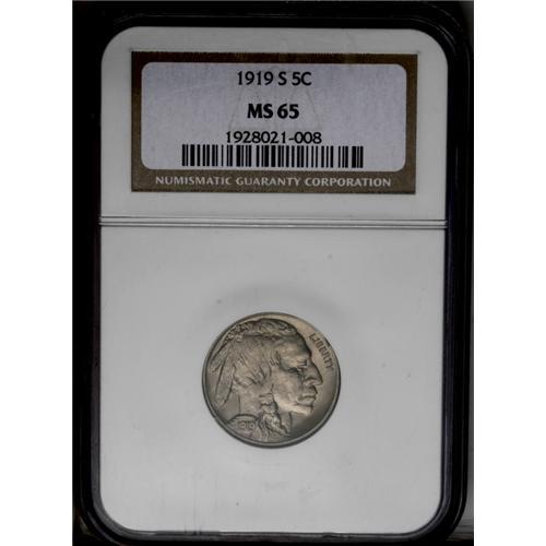 <B>1919-S<5C> MS65 NGC.</B></I> Although not complete, the strike on this difficult San Francisco issue is noteworthy for its crispness of detail. We report only slight incompleteness of strike on the bison's shoulder and head that does not, however, inhibit the pleasing appearance of this example. The surfaces are mark-free and display lovely steel-gray patina, along with shimmering mint luster and a slightly glossy appearance. A noteworthy striking rarity and condition rarity, the 1919-S is not often found with the technical and aesthetic attributes of the current offering, a lovely Gem that would seemingly enhance the quality of any high-grade collection. Census: 13 in 65, none are finer (7/06).