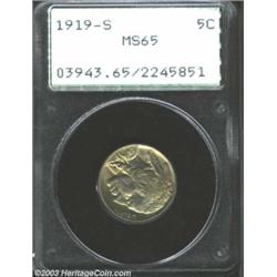 1919-S 5C MS65 PCGS. Both sides of this virtually untoned '19-S, one of the great condition rarities