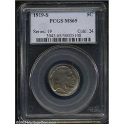 <table><tr><td><TABLE cellSpacing=0 cellPadding=0 width="100%" bgColor=#000000 border=0><TBODY> <TR><TD width="100%"><TABLE cellSpacing=1 cellPadding=3 width="100%" border=0><TBODY><TR><TD width="100%" bgColor=#79735c><FONT face=arial color=#ffffff size=3><B>Description</B> </FONT></TD></TR><TR><TD width="100%" bgColor=#ffffff><FONT face=arial size=2><B>1919-S 5C MS65 PCGS.</B></I> A notorious strike rarity, this date is typically offered with indistinct detail in the center of the obverse, around the reverse periphery, and over the bison's head, horn, and shoulder. This coin, however, is bold in all focal areas, and we note particularly impressive detail on the reverse over the bison's horn, the denomination, and the S mintmark. There is an even endowment of golden-orange patina draped over full, satiny textured luster. Neither side is 100% free of carbon, but we must state that the surfaces are free of singularly and outwardly distracting blemishes. Registry Set collectors would be wise to enter strong bids for this important strike and condition rarity. Actually, the 1919-S (7.5 million pieces produced) should not be considered common in any grade at or above the VF level--a fact that suggests extensive circulation in the years immediately following release from the mint. Population: 22 in 65, 1 finer (9/03). </FONT></TD></TR></TBODY></TABLE></TD></TR></TBODY></TABLE><BR><A name=PricesRealized></A><TABLE cellSpacing=0 cellPadding=0 width="100%" bgColor=#000000 border=0><TBODY><TR><TD width="100%"><TABLE cellSpacing=1 cellPadding=3 width="100%" border=0><TBODY><TR><TD width="100%" bgColor=#79735c><A name=PR><FONT face=arial color=#ffffff size=3><B>Previous Prices from Heritage Auctions</B> </FONT></A></TD></TR><TR><TD bgColor=#f6f6ed><TABLE cellSpacing=0 cellPadding=0 width="100%" border=1><TBODY><TR><TD align=middle width="33%"><B>Date</B></TD><TD align=middle width="33%"><B>Service</B></TD><TD align=middle width="33%"><B>Price</B></TD></TR><TR bgColor=whitesmoke><TD width="33%"><B>03/01/2003</B></TD><TD width="33%">NGC</TD><TD width="33%">$6,612.50</TD></TR><TR bgColor=whitesmoke><TD width="33%"><B>08/17/1996</B></TD><TD width="33%">NGC</TD><TD width="33%">$3,960.00</TD></TR></TBODY></TABLE></TD></TR><TR><TD bgColor=#ffffff><FONT face=arial size=1 ?>PLEASE NOTE: All prices realized reflect the final hammer price PLUS the buyer's premium in auctions that charge a buyer's premium. Each item has a notation at the top of the listing indicating whether that lot included a buyer's premium. Example: A item that sells with a final hammer price of $100 and a 20% buyer's premium will display with a price realized of $120. All information listed is intended to be as accurate as possible, but errors are possible. Please use this guide carefully and inform us of any inaccuracies. </FONT></TD></TR></TBODY></TABLE></TD></TR></TBODY></TABLE><BR><TABLE cellSpacing=0 cellPadding=0 width="100%" bgColor=#000000 border=0><TBODY><TR><TD width="100%"><TABLE cellSpacing=1 cellPadding=3 width="100%" border=0><TBODY><TR><TD width="100%" bgColor=#79735c colSpan=6><FONT face=arial color=#ffffff size=3><B>Price Guide*</B> </FONT></TD></TR><TR bgColor=#f6f6ed><TD align=middle><B>Grade</B> </TD><TD align=middle><B>Coin World<BR>(Trends)</B> </TD><TD align=middle><B>Numismedia<BR>Retail</B> </TD><TD align=middle><B>Numismedia<BR>Wholesale</B> </TD><TD align=middle><B>Coin<BR>Universe</B> </TD><TD align=middle><B>Heritage<BR>Value Index</B> </TD></TR><TR bgColor=#ffffff><TD align=middle>64</TD><TD align=right>$4,000.00</TD><TD align=right>---</TD><TD align=right>$2,975.00</TD><TD align=right>$3,750.00</TD><TD align=right>$2,690.63</TD></TR><TR style="FONT-WEIGHT: bold" bgColor=#cccfdd><TD align=middle>65</TD><TD align=right>$17,500.00</TD><TD align=right>---</TD><TD align=right>$11,500.00</TD><TD align=right>$17,500.00</TD><TD align=right>$10,737.50</TD></TR><TR bgColor=#ffffff><TD align=middle>66</TD><TD align=right>$35,000.00</TD><TD align=right>---</TD><TD align=right>$19,000.00</TD><TD align=right>$35,000.00</TD><TD align=right>$24,500.00</TD></TR><TR bgColor=#ffffff><TD colSpan=6><FONT size=1>*All information listed is intended to be as accurate as possible, but errors are possible. No item may be returned or refused based on this information which is provided as a service to our customers. You should contact each pricing source directly to determine the accuracy of this information. </FONT></TD></TR></TBODY></TABLE></TD></TR></TBODY></TABLE><BR><TABLE cellSpacing=0 cellPadding=0 width="100%" bgColor=#000000 border=0><TBODY><TR><TD width="100%"><TABLE cellSpacing=1 cellPadding=3 width="100%" border=0><TBODY><TR><TD width="100%" bgColor=#79735c><FONT face=arial color=#ffffff size=3><B>Population Guide</B> </FONT></TD></TR><TR bgColor=#ffffff><TD align=middle><!-- Begin Output of Population Grid--><TABLE cellSpacing=0 cellPadding=0 width="100%" border=0><TBODY><TR><TD vAlign=center><TABLE cellSpacing=0 width="100%" border=1 cellsadding="3"><TBODY><TR><TD vAlign=center><TABLE cellSpacing=0 cellPadding=3 width="100%" border=1><TBODY><TR><TD vAlign=center align=middle bgColor=#f0f1e8 colSpan=2 <CENTER><FONT face=Arial size=2><B>PCGS Pop </B></FONT><CENTER></CENTER></TD><TD vAlign=center align=middle bgColor=#f0f1e8 colSpan=2><CENTER><FONT face=Arial size=2><B>NGC Pop</B></CENTER></FONT></TD></TR><TR><TD vAlign=center><FONT face=Arial size=2>(65)</FONT> </TD><TD vAlign=center align=right><FONT face=Arial size=2>24</FONT> </TD><TD vAlign=center><FONT face=Arial size=2>(65)</FONT> </TD><TD vAlign=center align=right><FONT face=Arial size=2>12</FONT> </TD></TR><TR><TD vAlign=center><FONT face=Arial size=2>(>65)</FONT> </TD><TD vAlign=center align=right><FONT face=Arial size=2>1</FONT> </TD><TD vAlign=center><FONT face=Arial size=2>(>65)</FONT> </TD><TD vAlign=center align=right><FONT face=Arial size=2>0</FONT> </TD></TR></TBODY></TABLE></TD></TR></TBODY></TABLE></TD></TR></TBODY></TABLE><!-- End Output of Population Grid