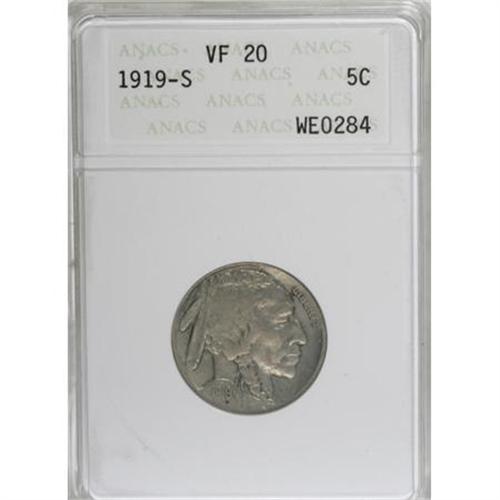 <B>1919-S 5C VF20 ANACS.</B></I> NGC Census: (9/482). PCGS Population (7/664). Mintage: 7,521,000. Numismedia Wsl. Price for NGC/PCGS coin in VF20: $84. (#3943)<BR><BR><B>Coin Engraver:</B> James E. Fraser<BR><BR><b>Shipping:</b> Coins & Currency (<a target="_blank" href="http://www.heritageauctions.com/common/shipping.php">view shipping information</a>)