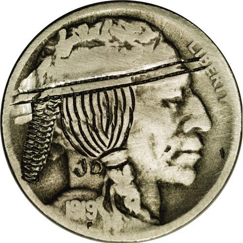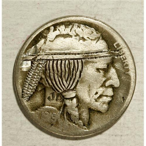 <B>1919-S:</B></I> John Dorusa, as one might guess, was not adverse to copying original carvings, most of which were done by George Washington "Bo" Hughes. Most of Bo's known works are illustrated in the two books on hobo nickels by Del Romines--this is another example. It depicts an Indian wearing a hat, with strengthened hair and feather. JD on neck. As with a good many of Dorusa's works, the coin has been lightly abraded on the obverse. An Average carving.<BR><BR><b>Shipping:</b> Coin/Currency (<a target="_blank" href="http://www.heritageauctions.com/common/shipping.php">view shipping information</a>)