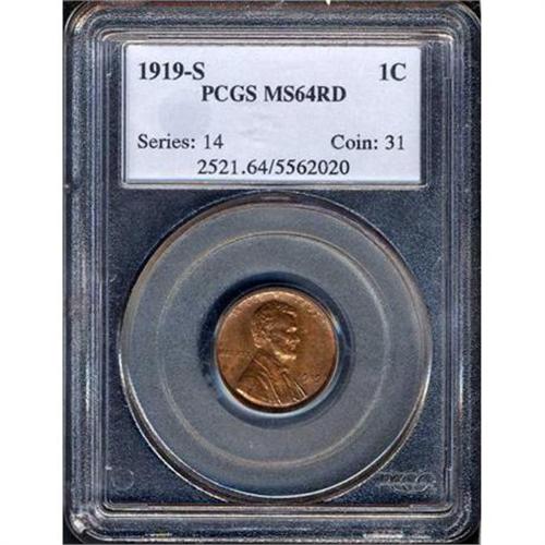 <b>1919-S Lincoln Cent. PCGS graded MS64 R.</b> An appealing deep red specimen, nicely struck, and unmarred by discoloration or spots. Quite difficult to encounter in this nice a grade in full red. Devices foursquare and bold throughout <b>(PCGS # 2521)</b>