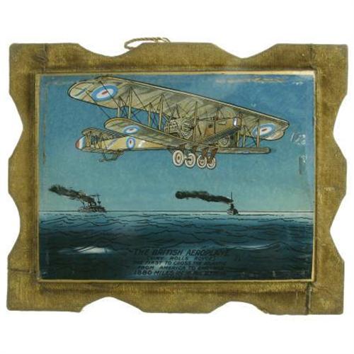 <B>1919 Transatlantic Flight Commemorative Plaque,</B></I> 10” x 8”, reverse painted glass on velvet-lined scalloped board, shows two warships escorting the Vimy IV plane piloted by John Alcock and Arthur Brown in the first non-stop Atlantic aerial crossing. Some fraying to felt, else excellent condition.<BR><BR><b>Shipping:</b> Miscellaneous Collectibles, Smal (<a target="_blank" href="http://www.heritageauctions.com/common/shipping.php">view shipping information</a>)