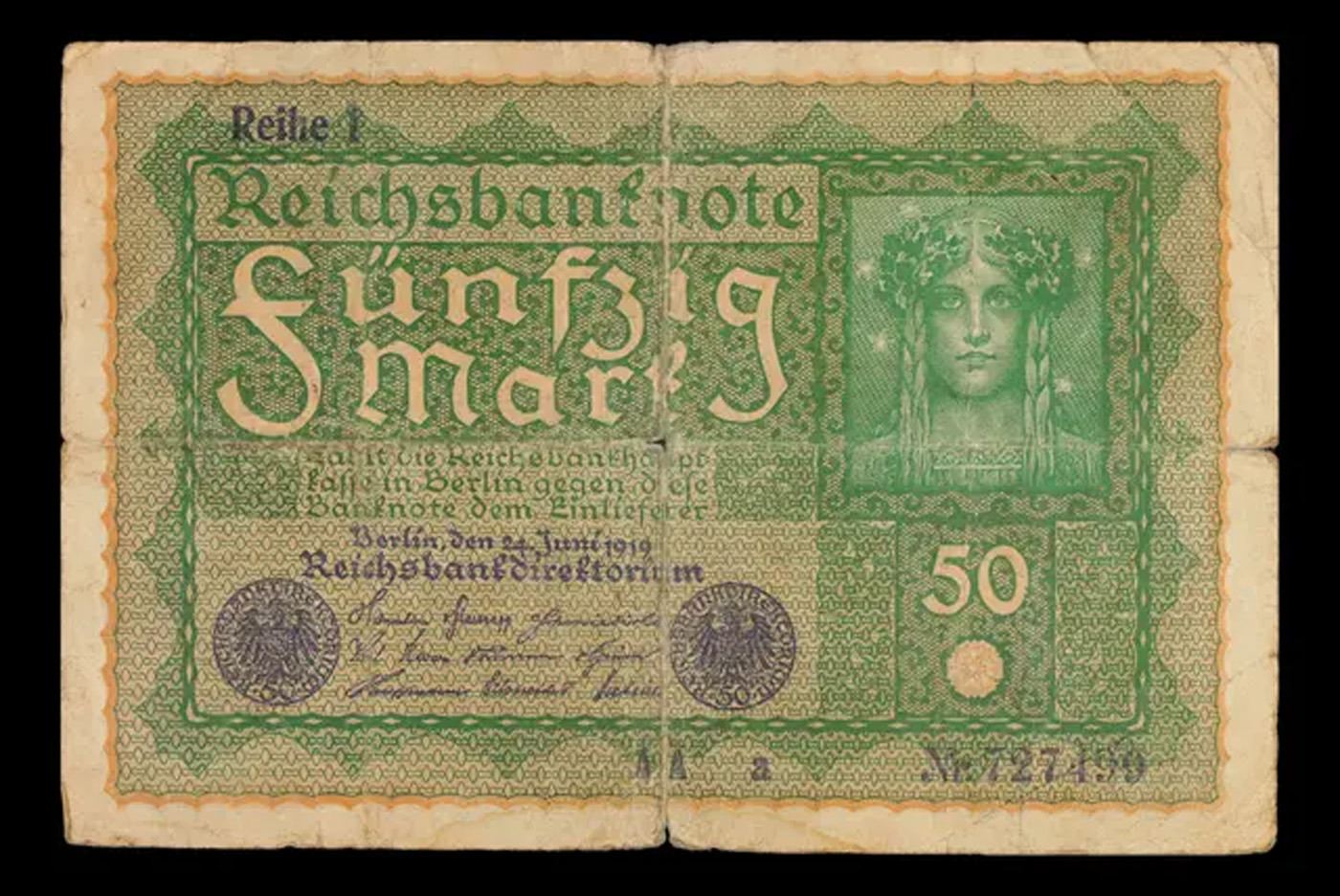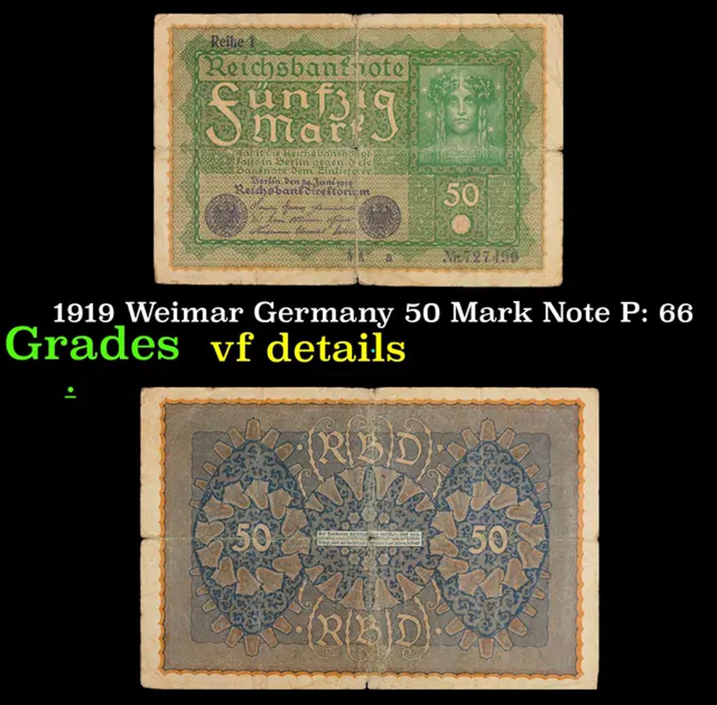 1919 Weimar Germany 50 Mark Note P: 66 Grades vf details. Notgeld is German for "emergency/necessity money". Notgeld typically refers to German and Austrian notes produced in the post-WWI period. Somewhat similar to Depression Scrip in the USA, these notes were issued when there wasn'te nough state-produced money available from the central bank. Issuing institutions were often a town's savings banks, municipalities, or private or state-owned firms. Nearly all issues contained an expiry date, after which time they were invalid. Issues without dates ordinarily had an expiry announced in a newspaper or at the place of issuance.