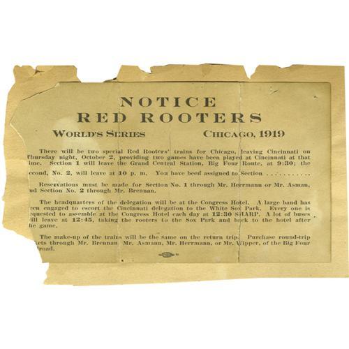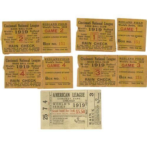 <B>1919 World Series Ticket Stubs Lot of 5.</B></I> With the possible exception of the inaugural Fall Classic in 1903, the most sought after and desirable World Series artifacts date to the scandalous October of 1919, when Shoeless Joe and seven Black Sox teammates conspired to take a dive for the money. Here we present ticket stubs used for admission to five of the Series' eight games. All four Crosley Field (Cincinnati Reds home) games are here, most notably the first game of the Series that saw Sox pitcher Eddie Cicotte bean the lead-off batter to signal that the fix was on. Also here is the third Comiskey Park (Chicago White Sox home) game, which was the fifth game of the Series. All stubs show an expected degree of wear, with creasing and edge wear. Cincinnati Game One has split along the perforations into two parts, and Game Four almost has done so as well. Chicago Game Three has glue staining on verso. Of course these flaws must be overlooked given the tremendous scarcity and desirability. Also here is a felt "Cincinnati Reds" armband worn by a Reds rooter. Glue from scrapbook on verso does not affect display. Finally, we have a notice of the train schedule for Reds fans traveling to Chicago, still affixed to a scrapbook page. Creasing and edge wear. Collection derives from a Cincinnati estate.