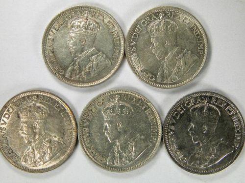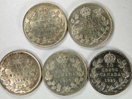Canada Ten Cents 1919 two pieces, 1920 and 1929 two pieces. Total five pale toned pieces, all EF-AU