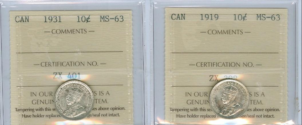 1919 and 1931 Lot of 2 ICCS graded 10¢ coins, both MS63 and brilliant.