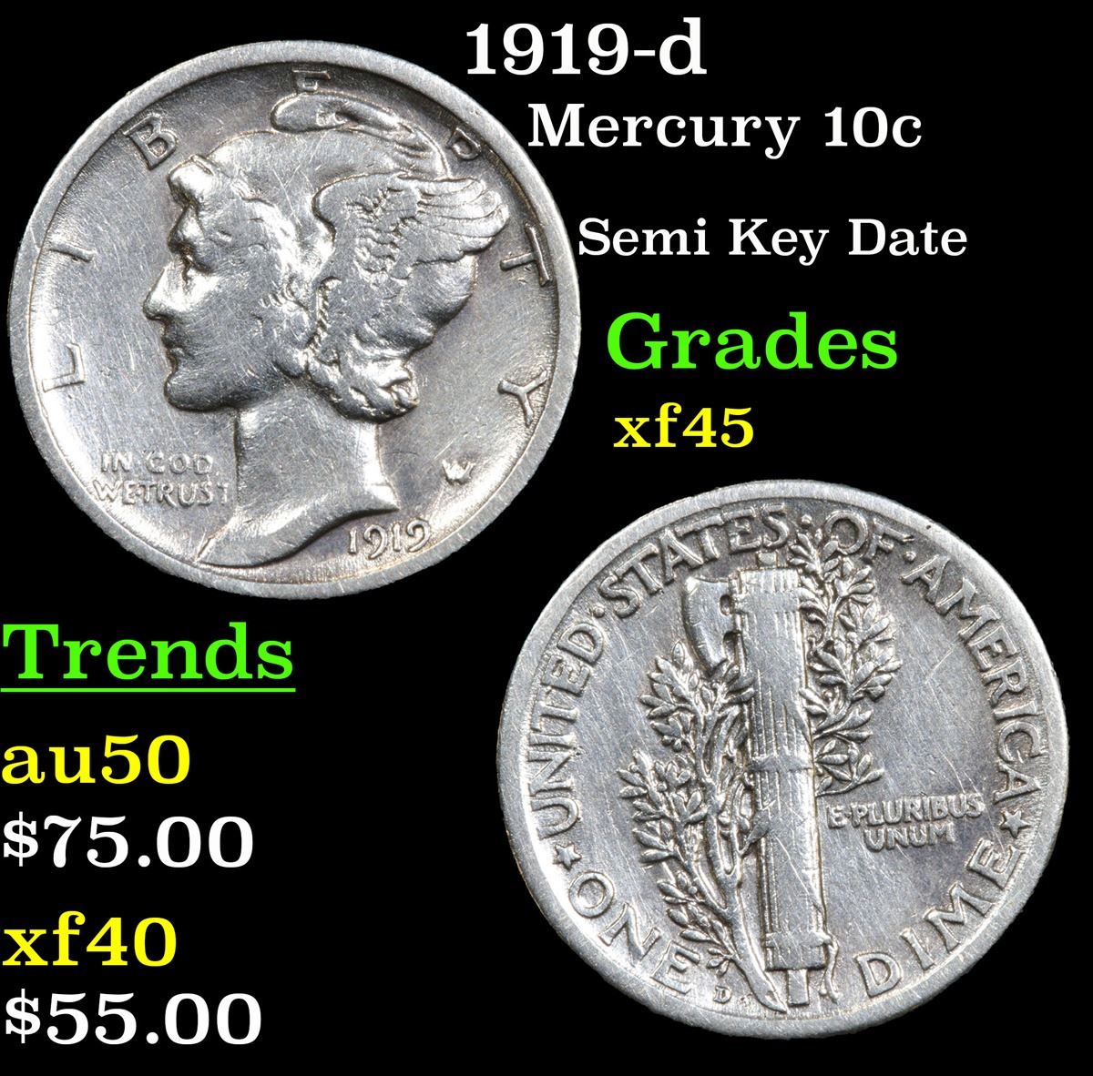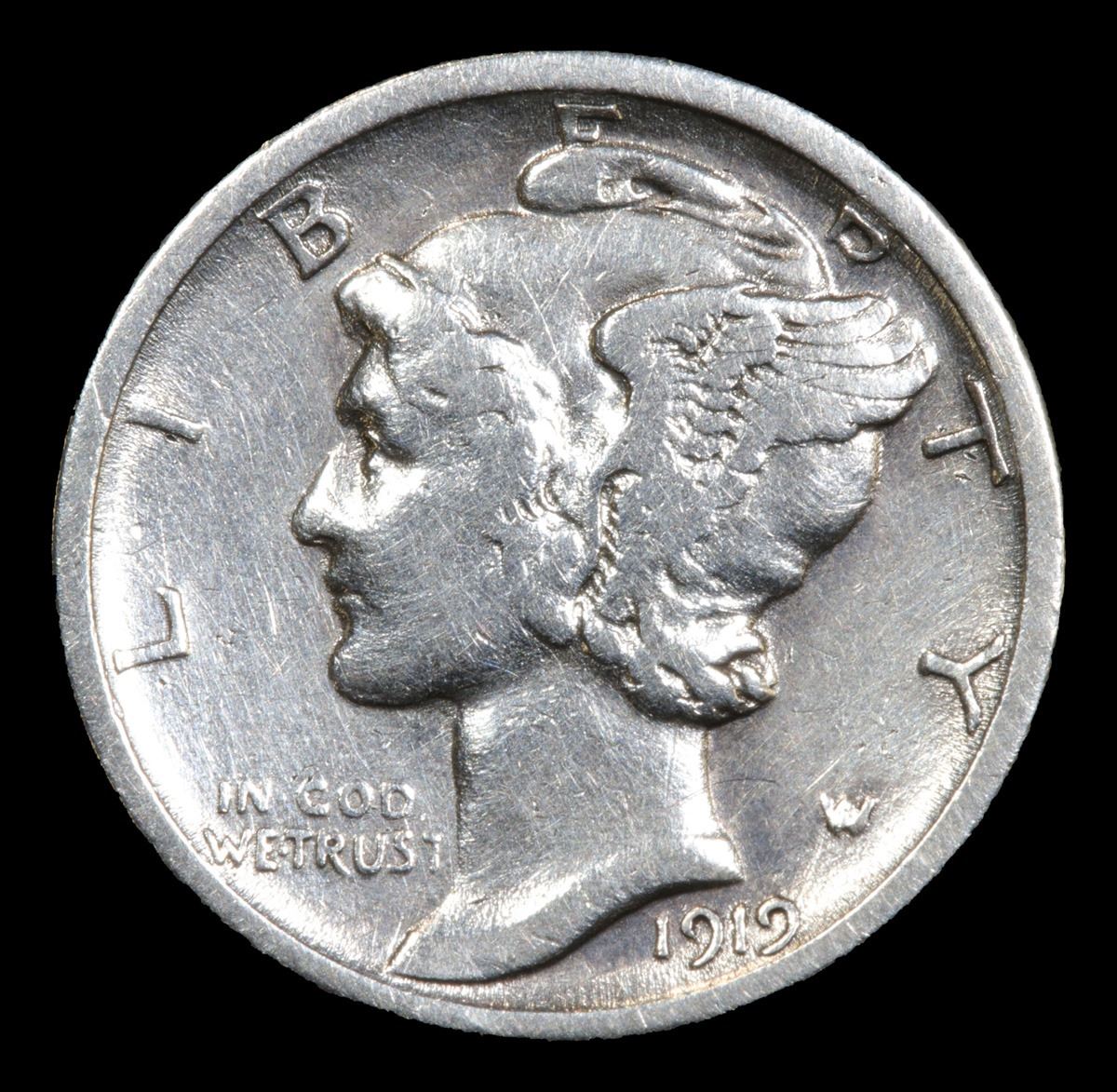 1919-d Semi Key Date . Mercury Dime 10c Grades xf+.