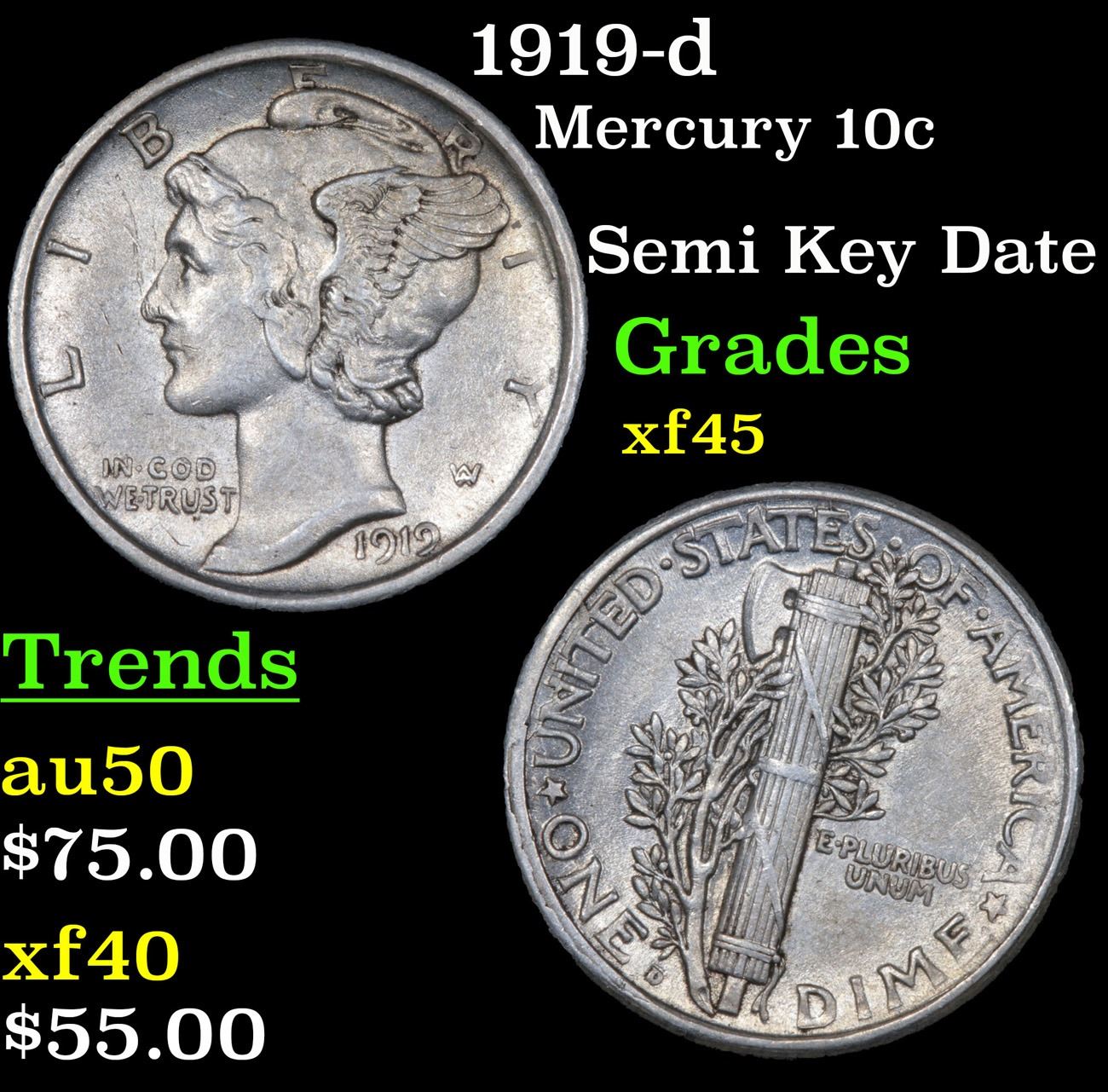 1919-d Semi Key Date . Mercury Dime 10c Grades xf+.