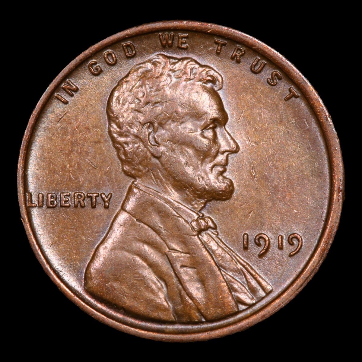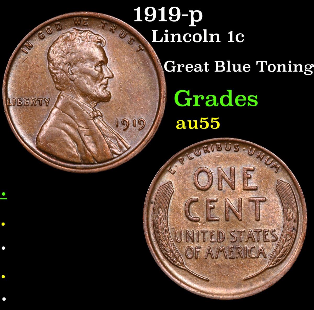 1919-p Great Blue Toning . Lincoln Cent 1c Grades Choice AU. Out of an original mintage of over 392 million pieces, PCGS estimates only 2500 survive in ms65 or better.