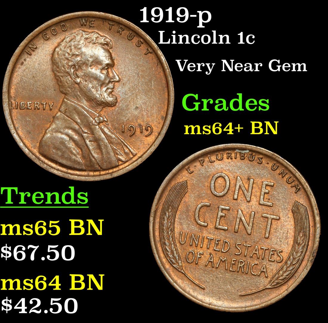 1919-p . Very Near Gem Lincoln Cent 1c Grades Choice+ Unc BN. Out of an original mintage of over 392 million pieces, PCGS estimates only 2500 survive in ms65 or better.