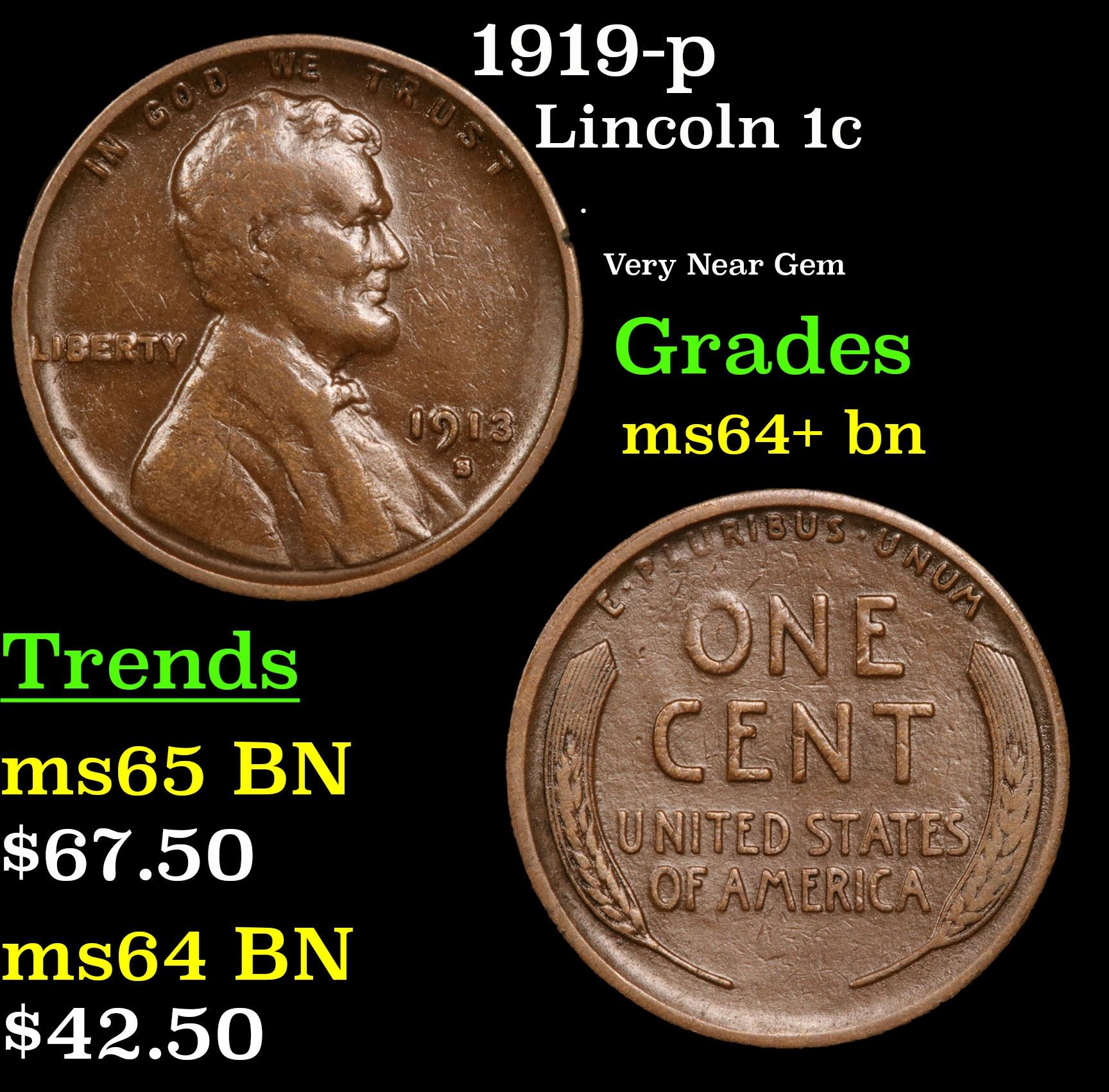 1919-p . Very Near Gem Lincoln Cent 1c Grades Choice+ Unc BN. Out of an original mintage of over 392 million pieces, PCGS estimates only 2500 survive in ms65 or better.
