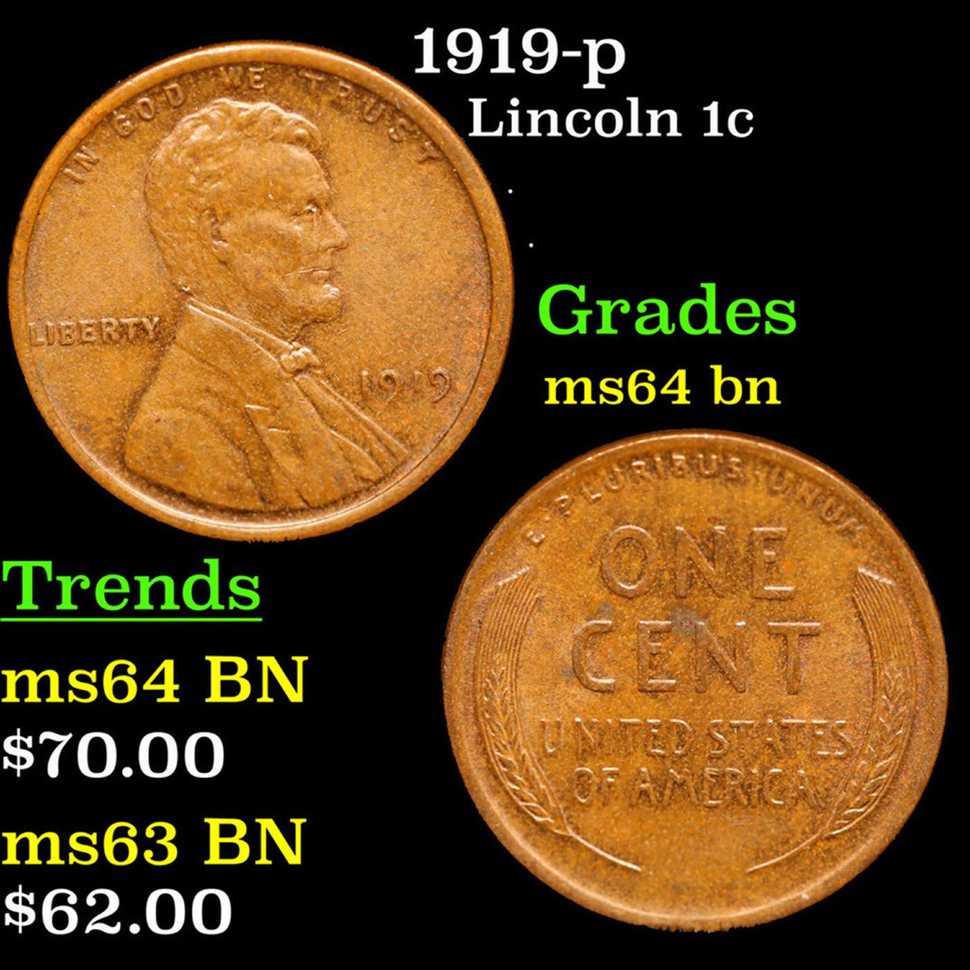 1919-p Lincoln Cent 1c Grades Choice Unc BN.