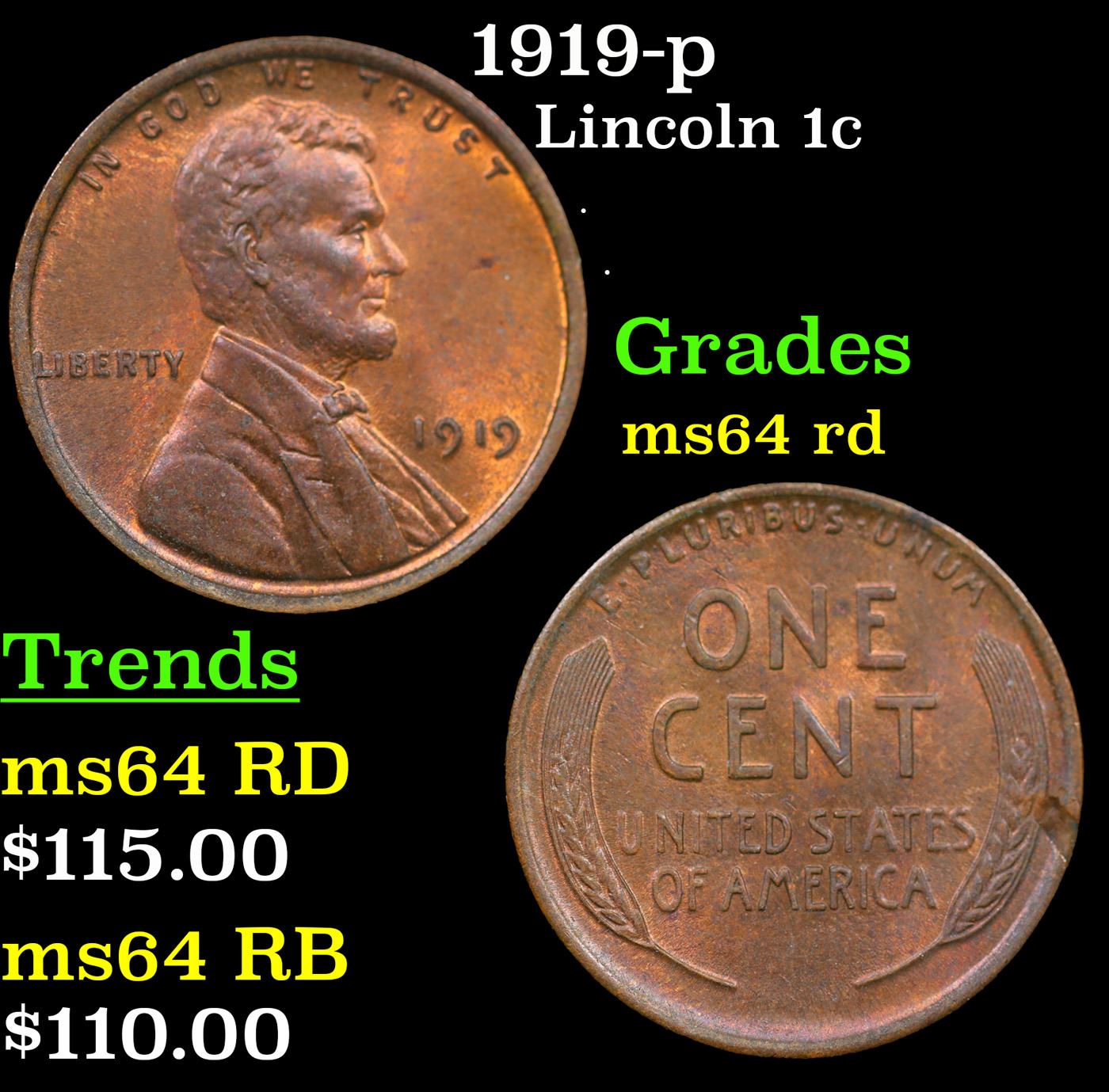1919-p Lincoln Cent 1c Grades Choice Unc RD.