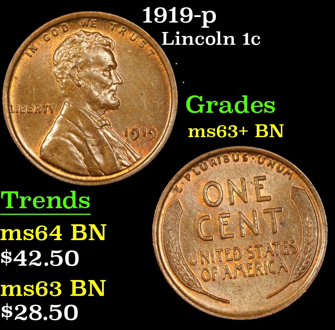 1919-p . . Lincoln Cent 1c Grades Select+ Unc BN. Out of an original mintage of over 392 million pieces, PCGS estimates only 2500 survive in ms65 or better.