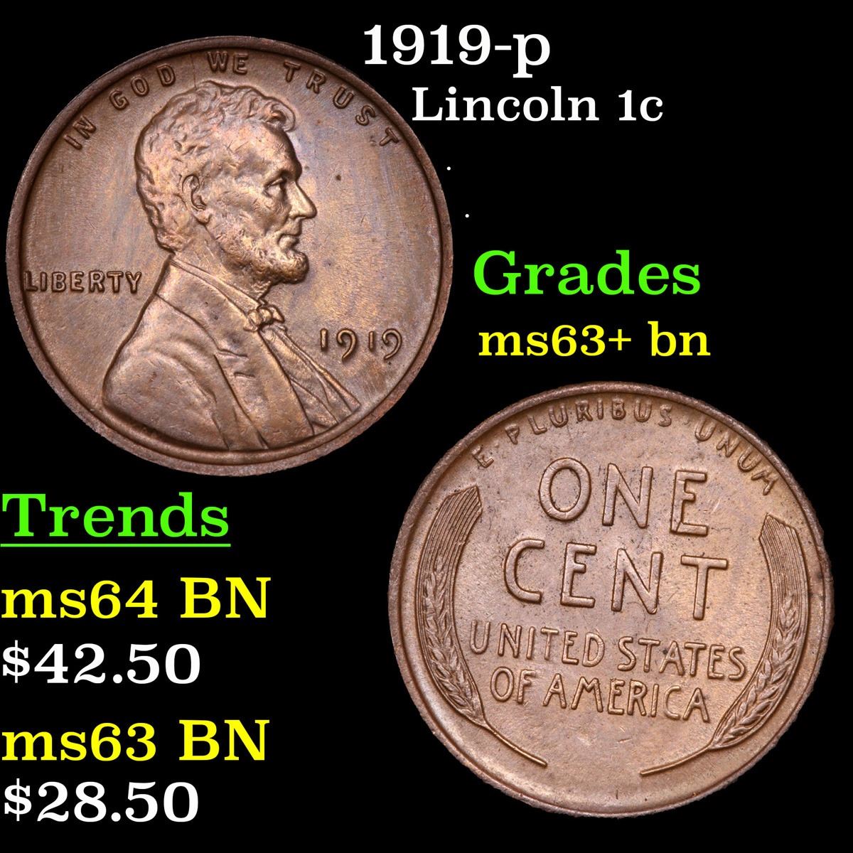 1919-p . . Lincoln Cent 1c Grades Select+ Unc BN. Out of an original mintage of over 392 million pieces, PCGS estimates only 2500 survive in ms65 or better.