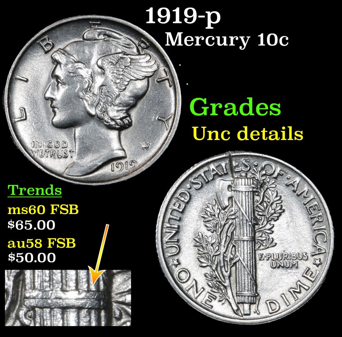 1919-p . . Mercury Dime 10c Grades Unc Details.