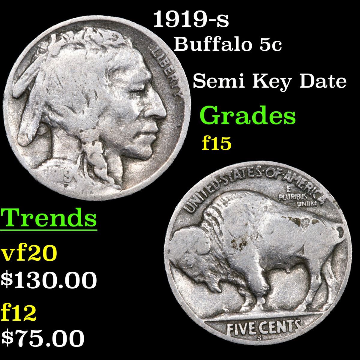 1919-s Semi Key Date . Buffalo Nickel 5c Grades f+. According to David Hall, the 1919-s is scarce in circulated grades. Most of the killer rarities in the Buffalo nickel series are the 1918 thru 1927 San Francisco issues.