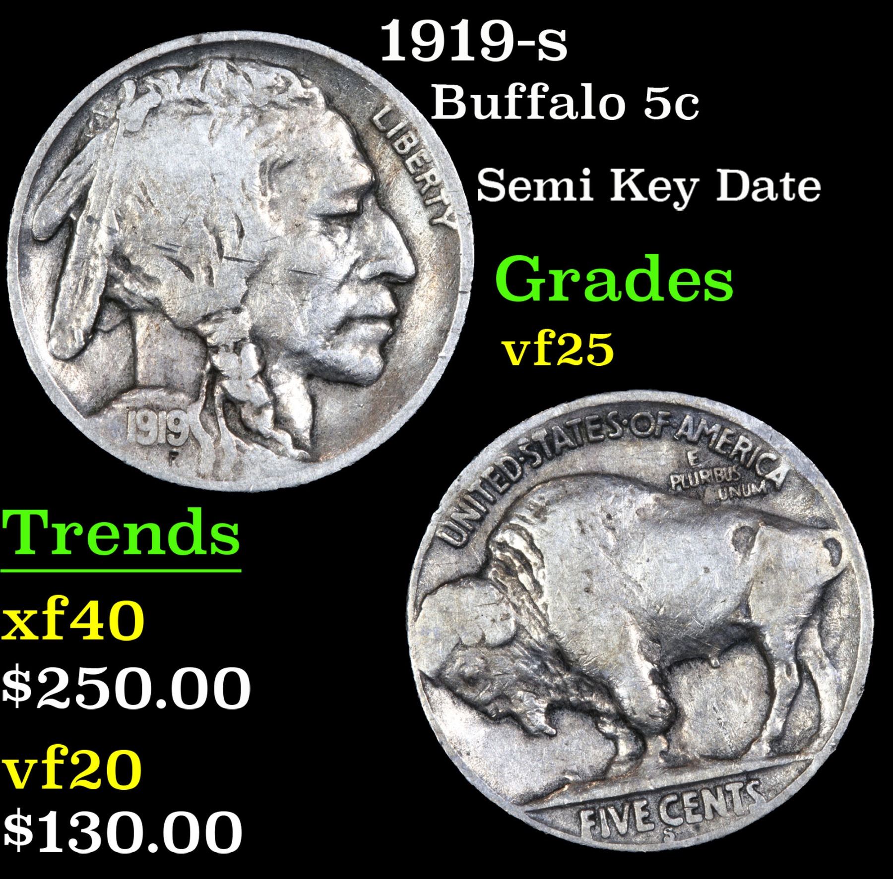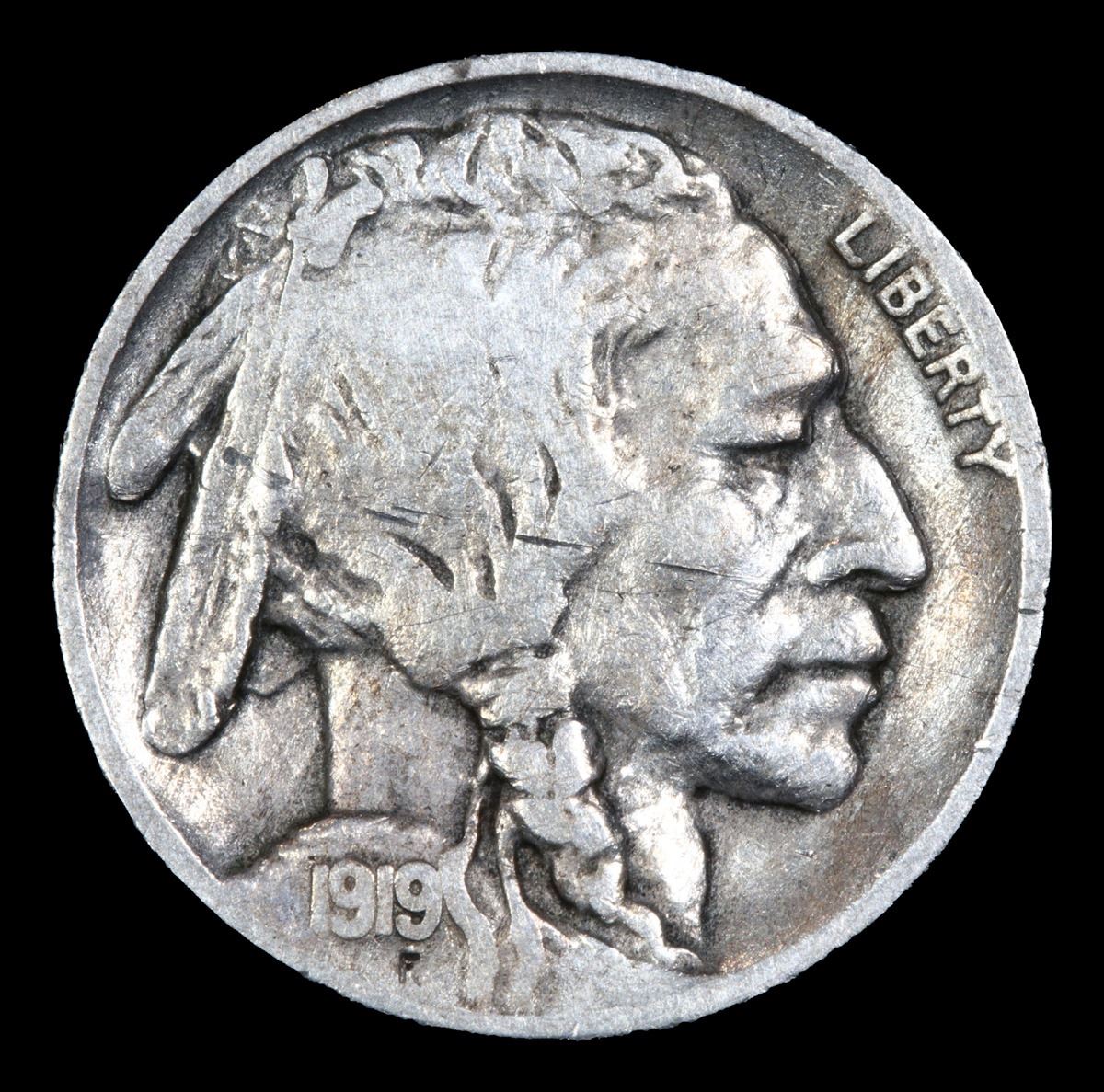 1919-s Semi Key Date . Buffalo Nickel 5c Grades vf+.  According to David Hall, the 1919-s is scarce in circulated grades.  Most of the killer rarities in the Buffalo nickel series are the 1918 thru 1927 San Francisco issues.