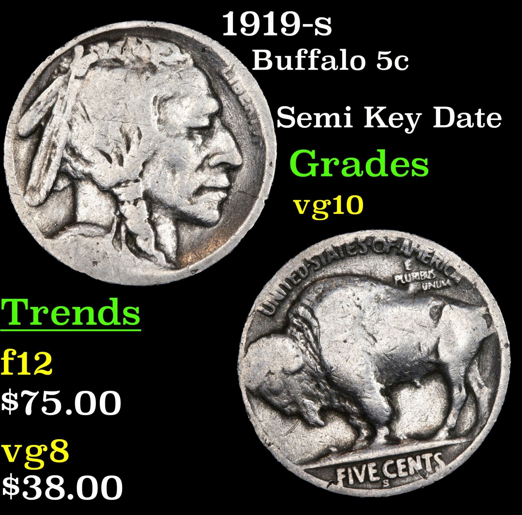 1919-s Semi Key Date . Buffalo Nickel 5c Grades vg+. According to David Hall, the 1919-s is scarce in circulated grades. Most of the killer rarities in the Buffalo nickel series are the 1918 thru 1927 San Francisco issues.