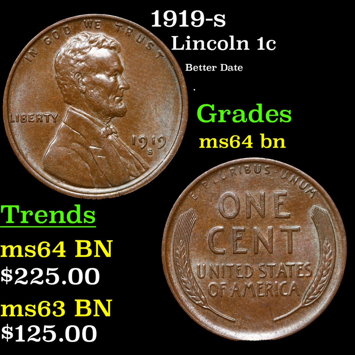 1919-s Lincoln Cent 1c Grades Choice Unc BN.