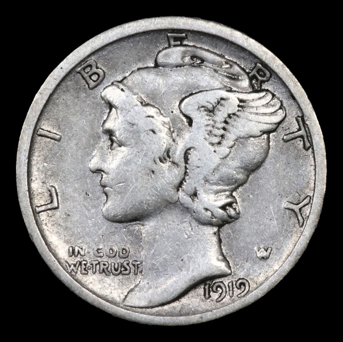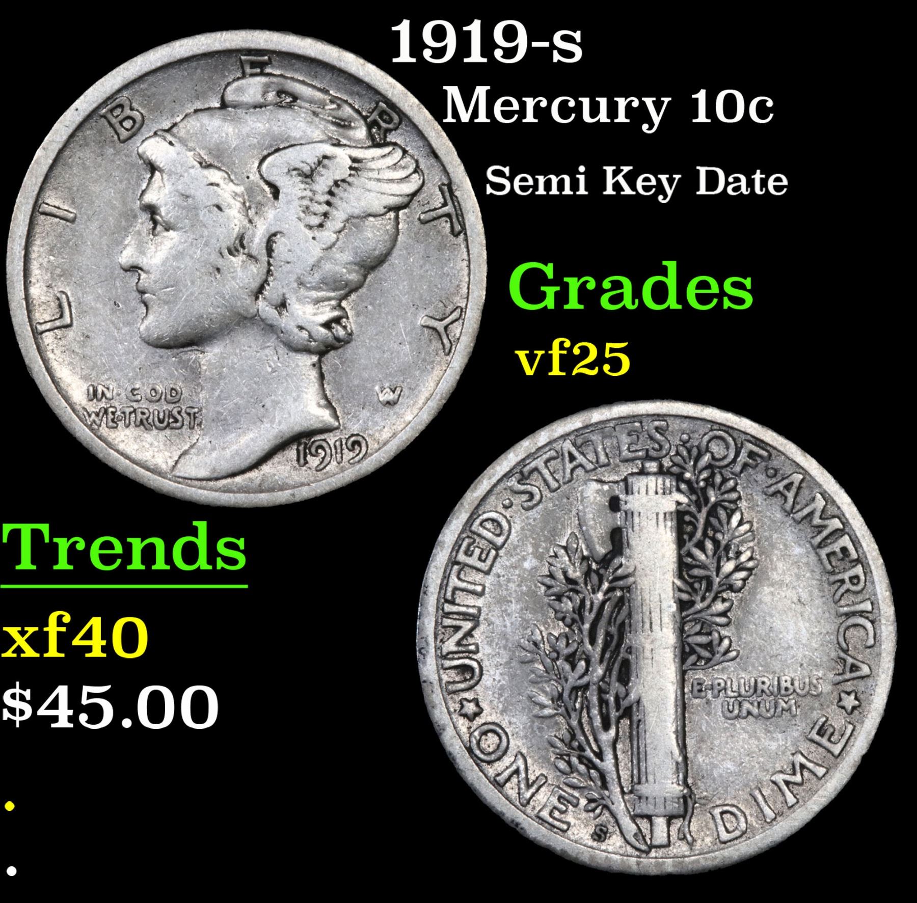 1919-s Semi Key Date . Mercury Dime 10c Grades vf+.