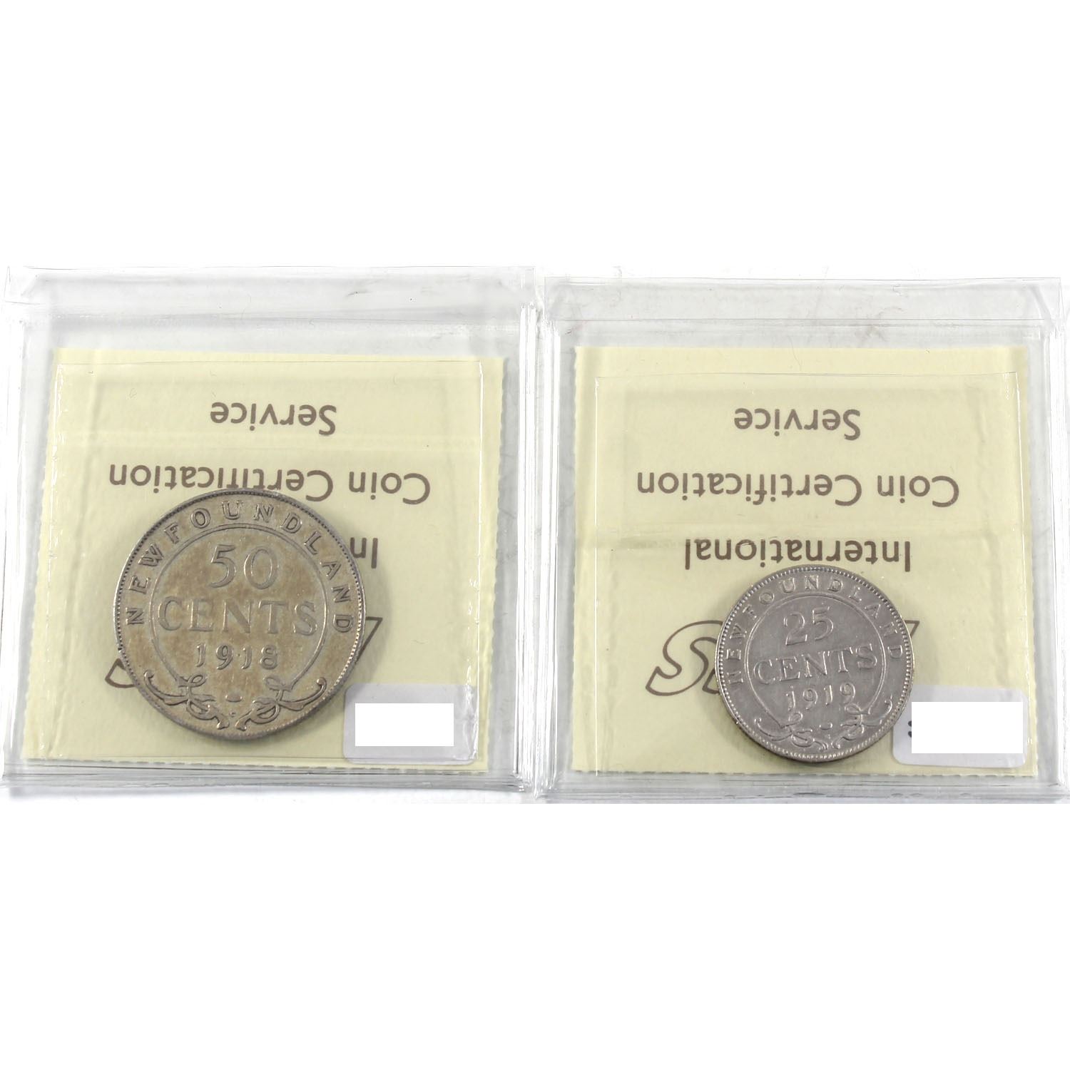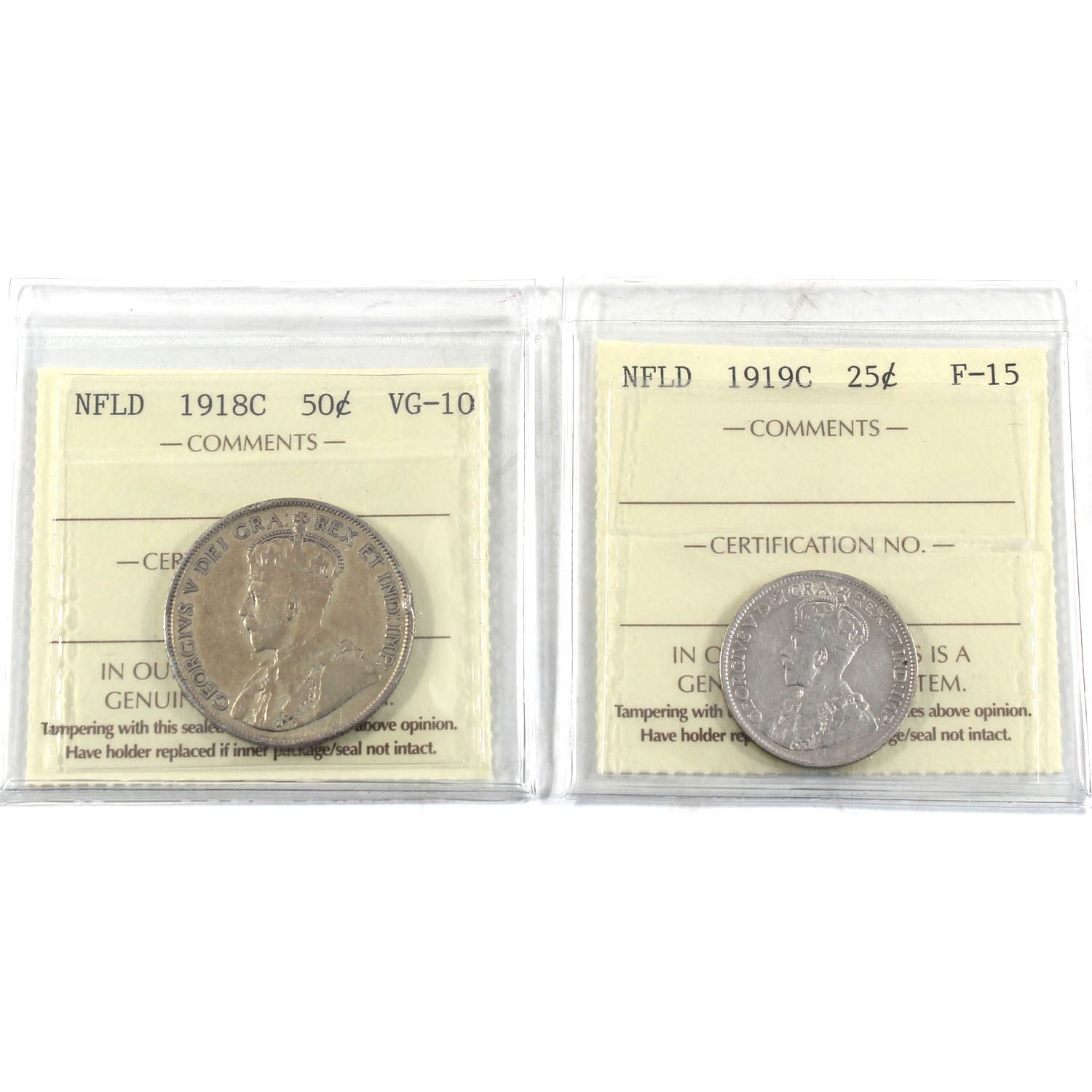 1919C Newfoundland 25-cent ICCS Certified F-15 & 1918C Newfoundland 50-cent ICCS VG-10. 2pcs