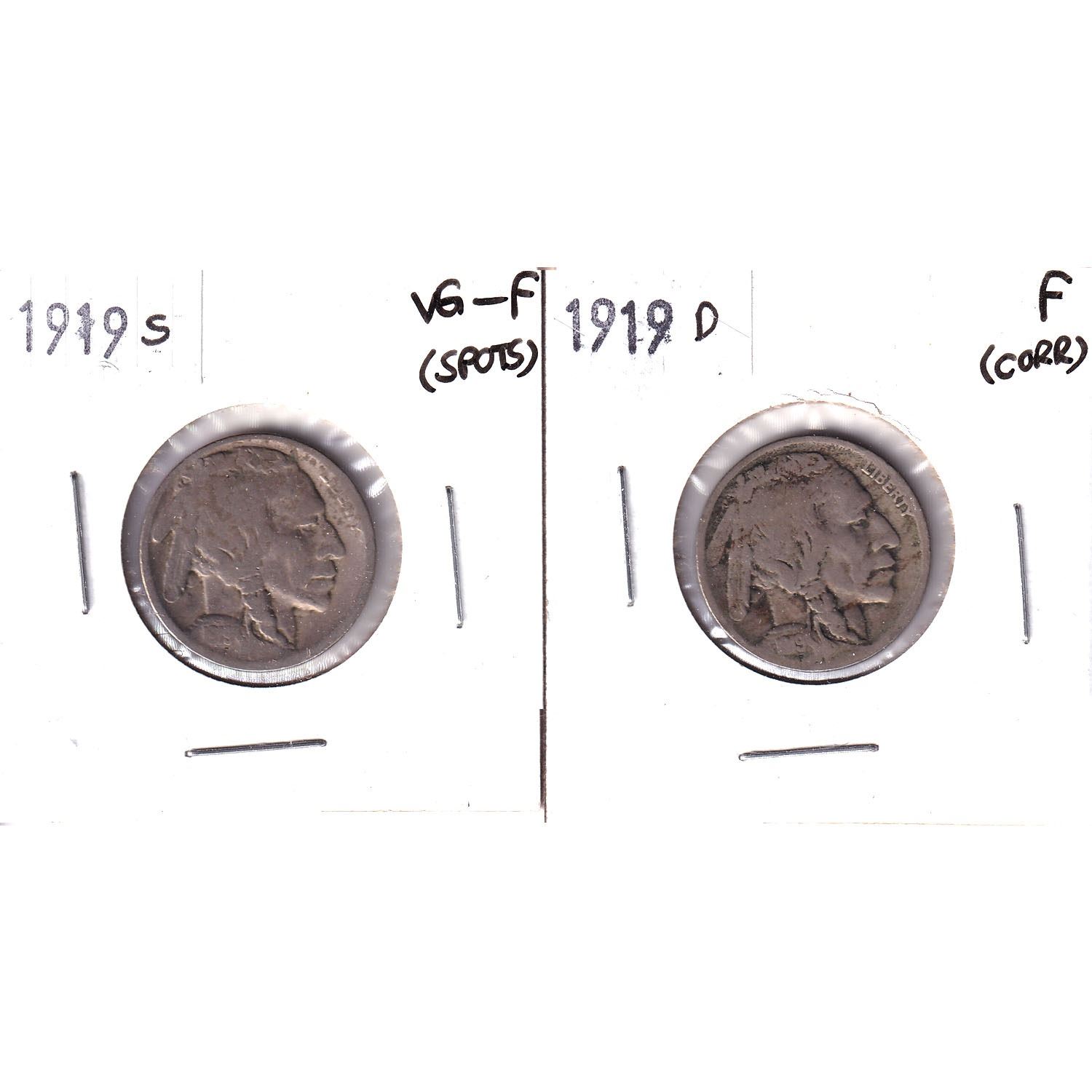 1919S USA 5-cent VG-Fine (Spot) & 1919 D USA 5-cent Fine (Corrosion). 2pcs