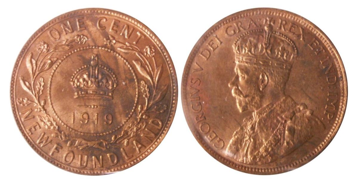 1919c Nfld 1¢ ICCS MS64RD.80% red with lustre. Only two examples finer.