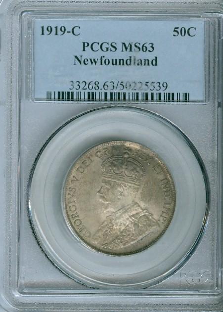 1919c Nfld 50¢ PCGS MS-63, lightly toned. A scarce date.